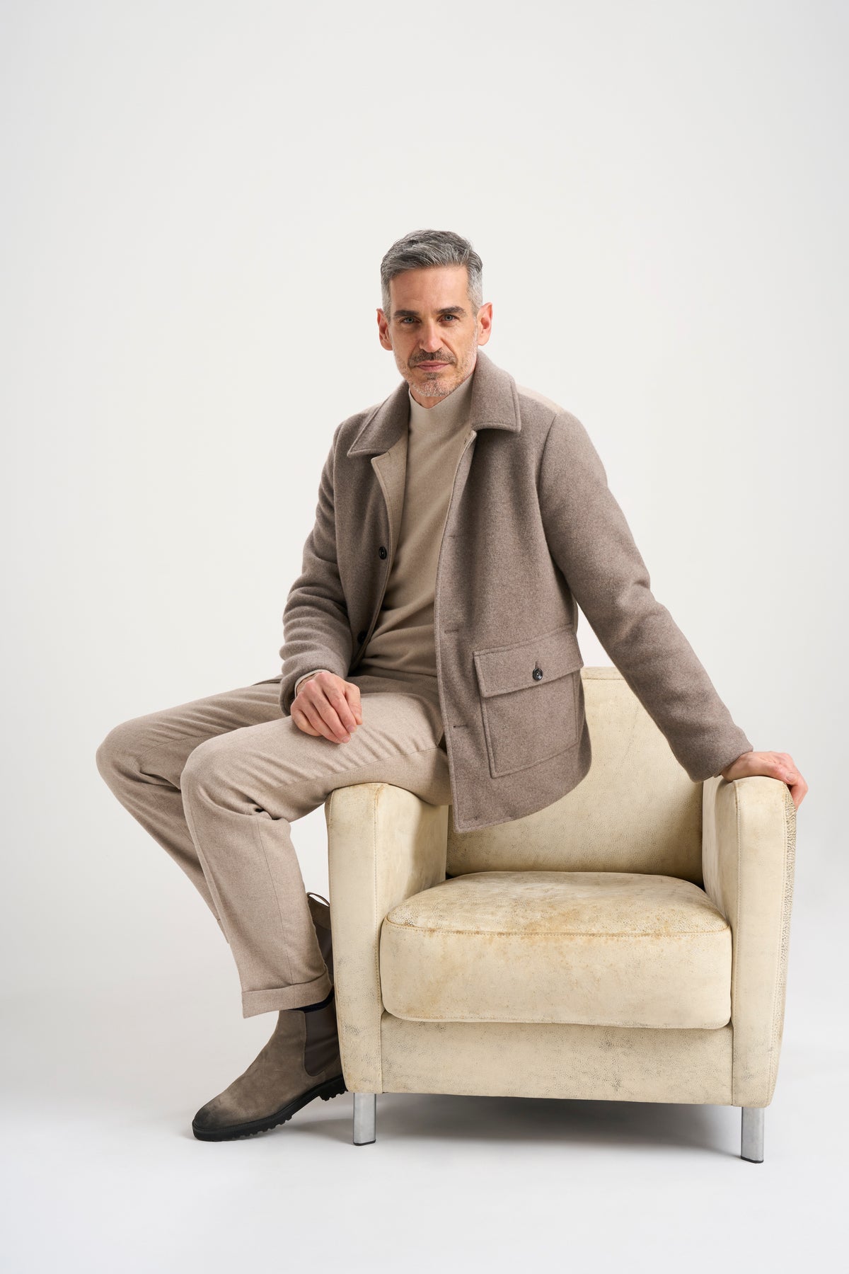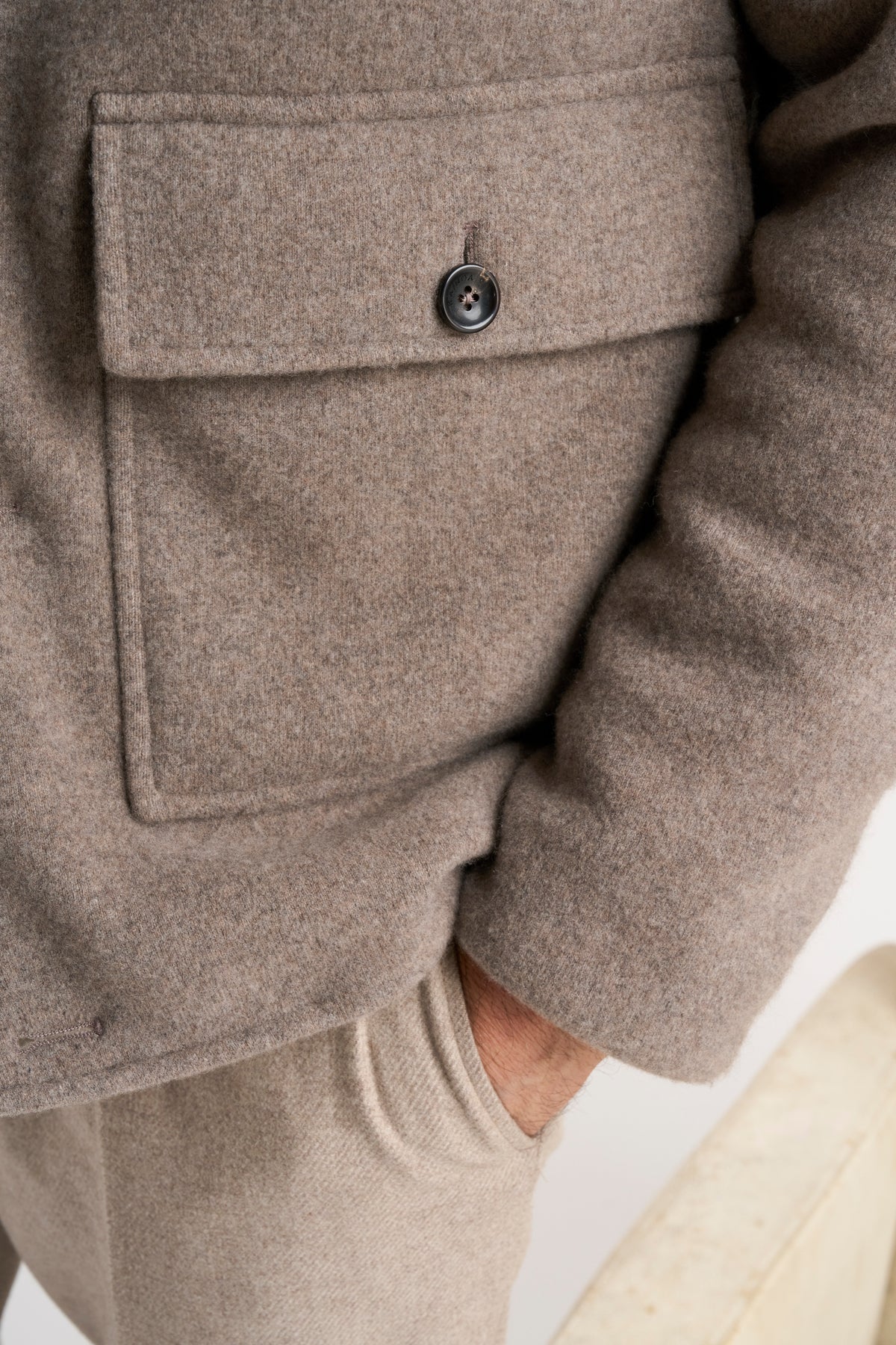 Featuring a sophisticated shirt collar and practical flap pockets, this Italian-made piece combines meticulously constructed wool-cashmere panels on the front, back, sleeves, and collar—knitted, washed, felted, and hand-cut for precision—insulated by premium 90/10 down.