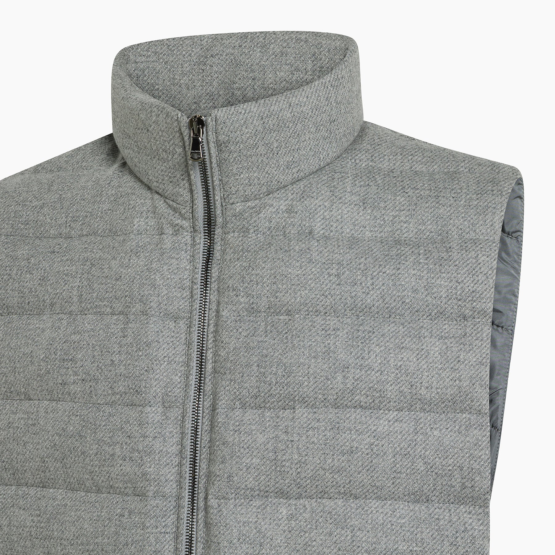 - The vest features a combi front opening, providing ease of use and a sleek appearance. Pockets are equipped with brushed metal zips and customized KA/NOA sliders, adding a touch of refined detail to the design.