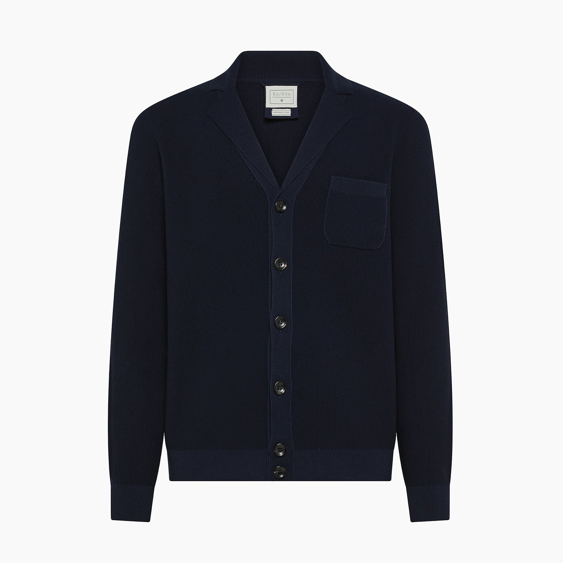 The SIMON cardigan showcases sophisticated rice stitch construction on 14-gauge frames with a distinguished rever collar and plain knit front opening. Crafted with meticulous attention to detail, it features a left chest pocket with tubular edging, matching tubular-knit hem and cuffs, and premium horn buttons.